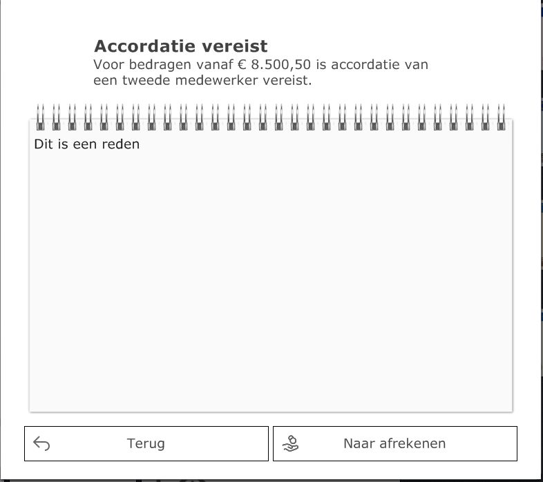 Er is een optie bijgekomen om vanaf een in te stellen bedrag om accordering te vragen voor het afrekenen van een bon. Deze accordering kan gedaan worden door een tweede medewerker die mag afrekenen op dat filiaal. Ook kan ingesteld worden dat de medewerker dit zelf mag doen, maar dan moet er een reden opgegeven worden.